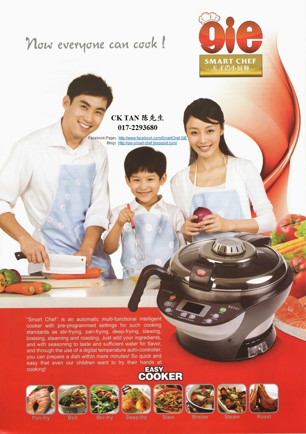 GIE Smart Chef “天才小厨师”时尚锅设置了多项智能自动烹饪功能,能自动煎,炒,炸,焖,炖,蒸,烤等多种烹饪技法,只需将准备好的主料,辅料,调味料及适量的水,全部一次性加入锅中,只需手指轻轻一按,全自动数码控制火候,方便快捷,连小孩也能轻松烹饪出健康营养菜肴!